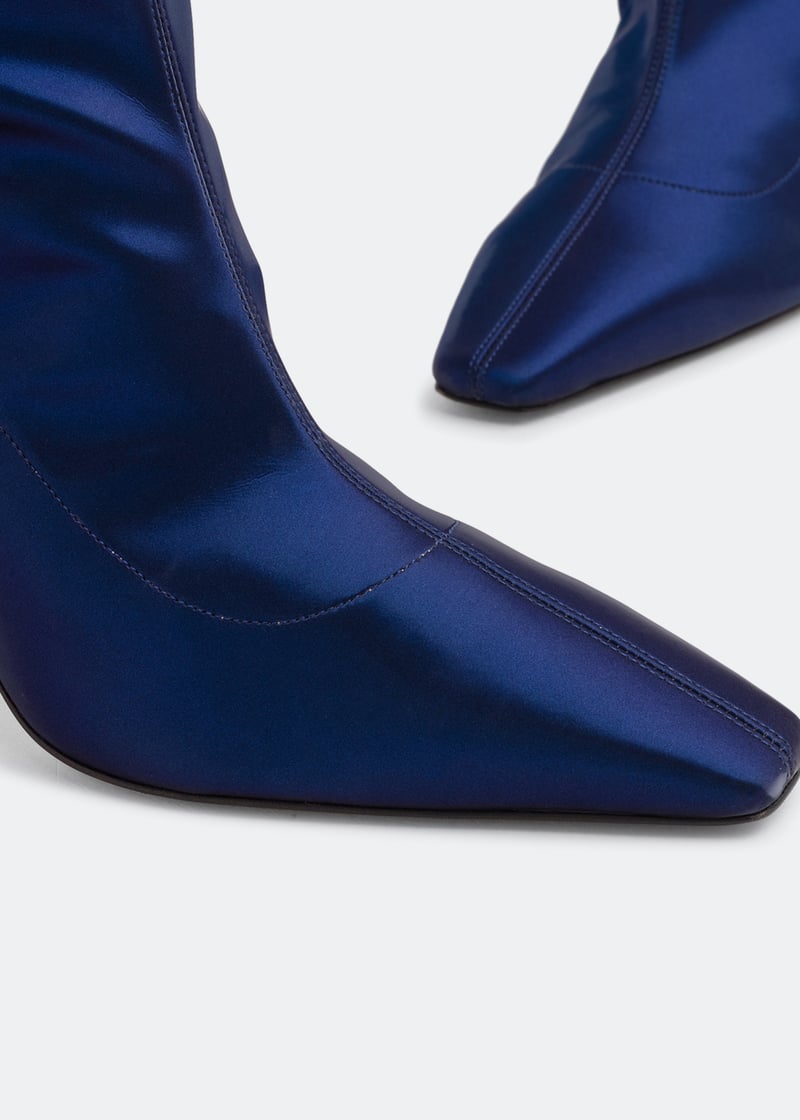 يعتبر بوت ميرلين لا غنى عنه لأناقتكِ في الموسم الجديد، فهو يتميز بكعب بيفيري المنحني الشهير ويأتي مصنوعاً من خامة فلاش تكنو الفاخرة باللون الأزرق القزحي مع مقدمة مدببة بشكل حاد وسحّاب جانبي للإغلاق. سيكون هذا البوت بطول الكاحل مثالياً مع كل إطلالاتكِ.
