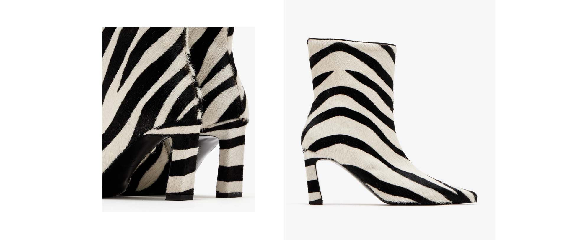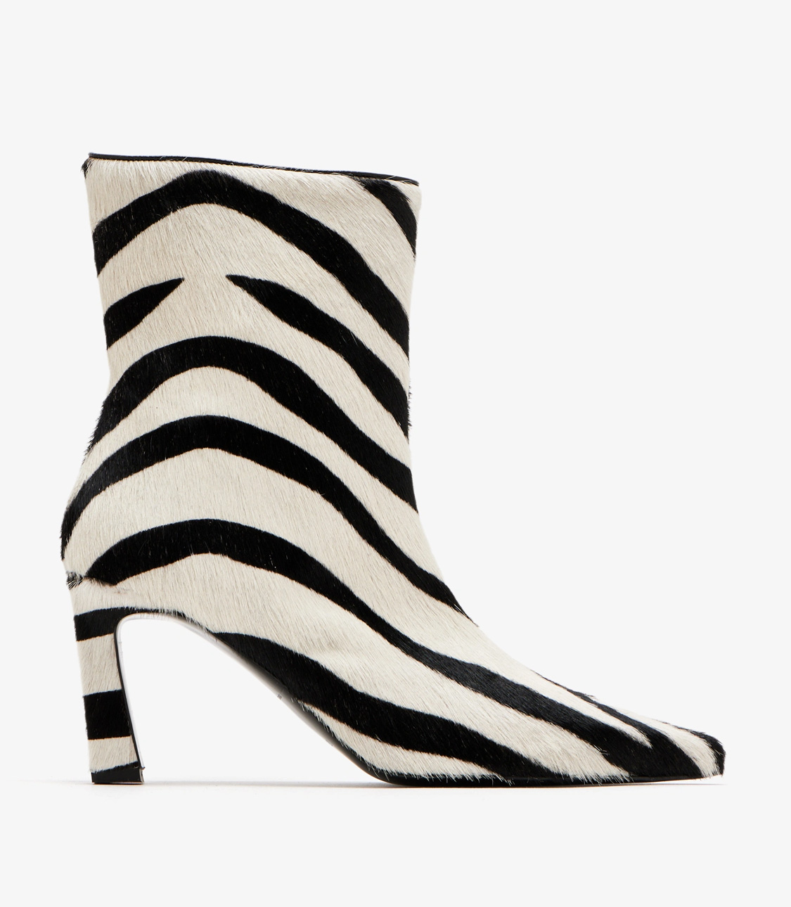 الجرأة الفاخرة! يأتي هذا البوت مصنوعاً من شعر العجل بطبعة الحمار الوحشي الرائجة حالياً وكعب مائل ليمنحكِ الثبات والراحة أينما تذهبين هذا الخريف.