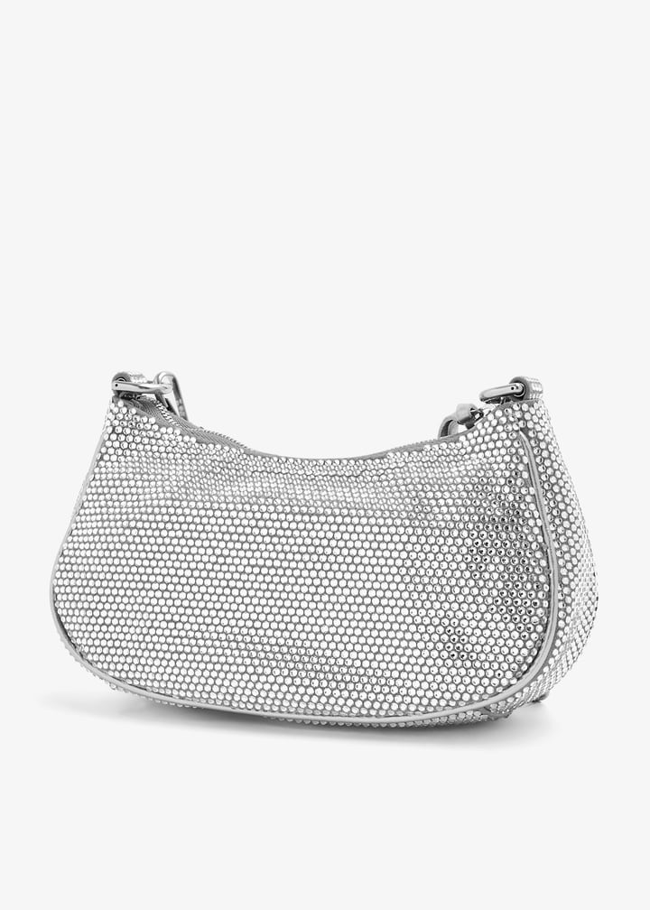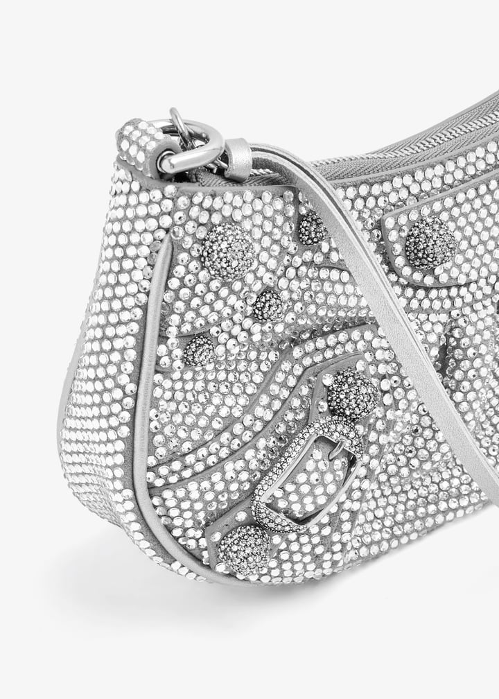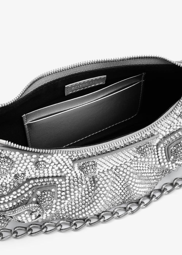 The Le Cagole mini chain bag from Balenciaga is crafted from suede calfskin and metallised Nappa lambskin and presented with a completely rhinestone-embellished upper to light up any outfit. It features a shoulder chain strap with one hook, an adjustable and removable crossbody strap, zipper closure with knotted leather pullers, and two inner card slots.