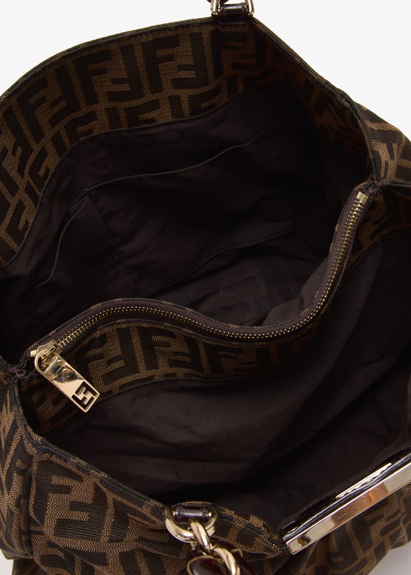 Fendi proves that style and function can go hand in hand with the iconic Mia tote. Made from classic Zucca canvas, it features chain and leather strap top handles, along with a metallic FF logo detail for a signature finish. This pre-owned piece will make a great contribution towards sustainability and an even greater contribution towards your wardrobe.