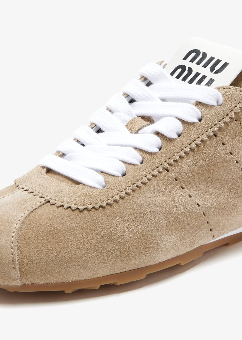 In a sleek and extremely light design, Miu Miu's Plume suede sneakers showcase refined workmanship and materials in a versatile, streamlined silhouette. They're built on a rubber sole with perforated lines on the side, a removable leather insole, and a screen-printed logo on the tongue and heel counter.