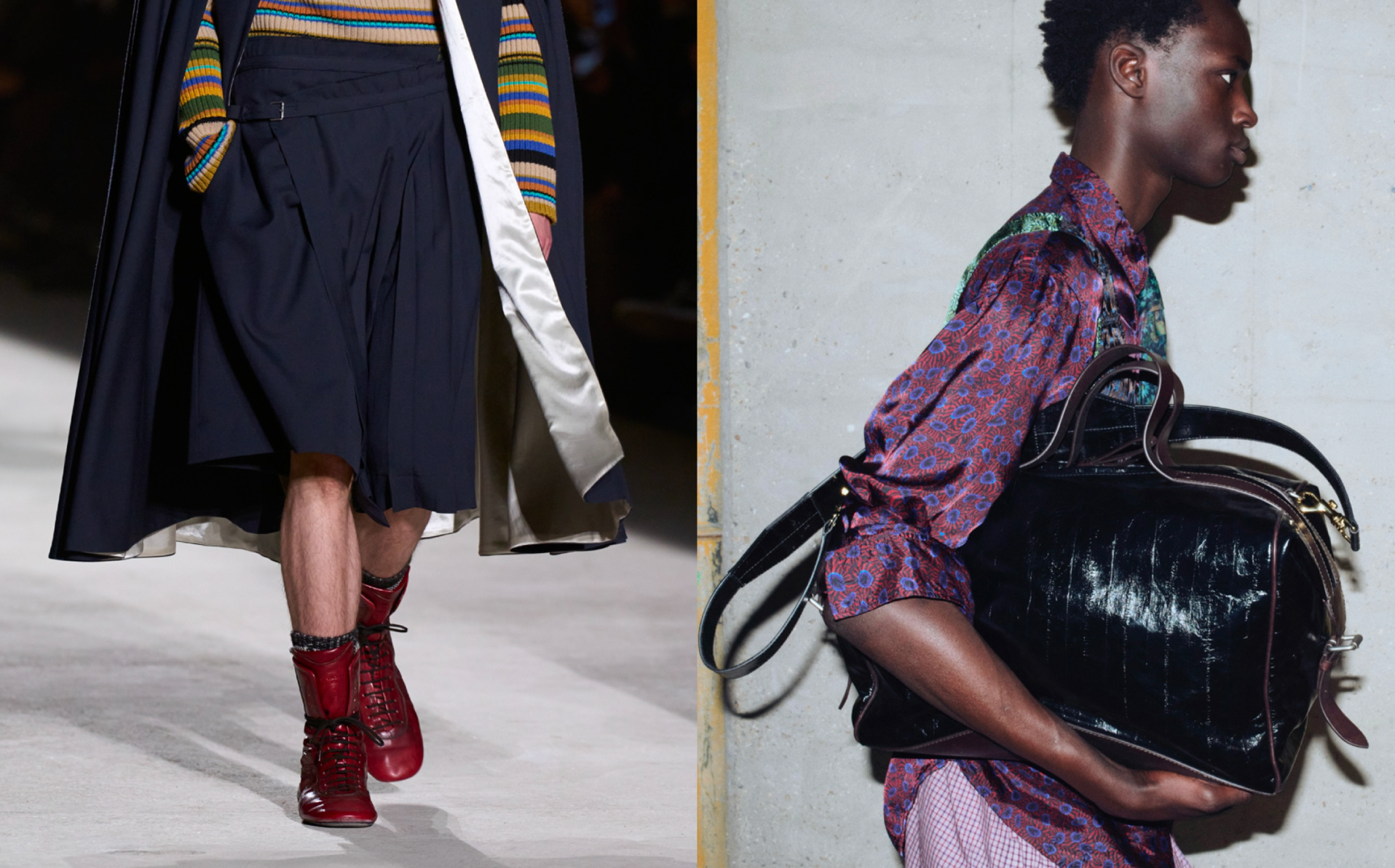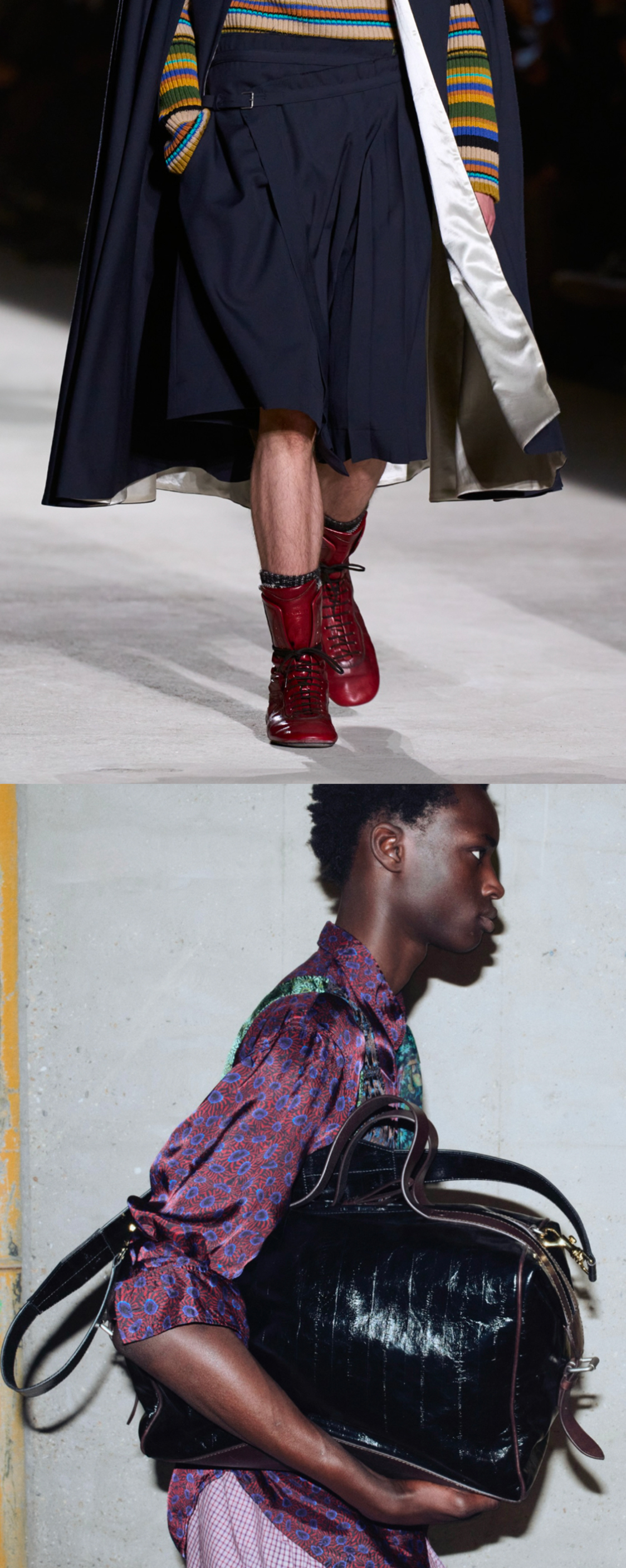 I recall being introduced to Louboutin by Jaden Smith, who said: “My starting point was revisiting the tuxedo shoe through a more juvenile lens, because men were first introduced to the brand through occasion dressing.” Now there’s room for contemporary reinterpretations of classics through a lighter, playful lens. At Dries Van Noten, nostalgia was present throughout: men appeared almost like schoolboys, carrying satchels and wearing high-top sneakers for days filled with responsibilities, and playful activities.